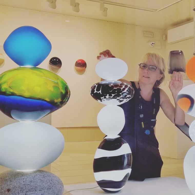 Paula Pääkkönen created a sculpture in Berengo Studio.The glass demo’s are the soul of the project, because in the studio, the glass is alive. Marja Hepo-aho, Paula Pääkkönen and Sini Majuri hosted multiple demo’s in the studios in Murano. It is a rare opportunity to connect in this special way – and to be welcomed in these magical places that are often hidden from the public.There are eight glass artists in the first FRESH Finland exhibition: Sini Majuri, Marja Hepo-aho, Anu Penttinen, Anna Schroderus, Camilla Moberg, Paula Pääkkönen. Helmi Remes, Anna-Kaisa Kukkonen-Madi. In the picture the group celebrates the opening gala of the Glass Week. It was delightful also meet Laura from A’Design Award and receiwe the winner book from my designs. It’s interesting to open a discussion about the role of the studio glass in international Design Awards. We should definitely see it as a category.My work Technicolor mixes blown glass and fish skin. It expresses femininity in classic movies. It is also a combination of three rare craftsmanships: blacksmith, cobbler and a glass blower works.During the Venice Glass Week was a great honor to also take part into discussion panel about Future innovations about glass art. You can see the panel from glass weeks youtube channel. Sini Majuri’s works were also in the Venice Glass Week HUB exhibition in Palazzo Loredan.