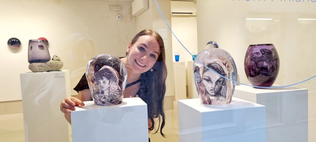 The exhibition travelled to Venice by a van. Olli from Fixupaku drove the glass all the way from Helsinki. The Fresh Finland exhibition was loaded on a boat and sailed across the busy canals! Transporting art requires special knowhow and planning.The exhibition for the glass week gathered eight glass artists together. Each of the group has a unique expression. The project also represented four Finnish glass studios, that create high quality sculptural glass: Mafka&Alakoski, Lasismi, Lasikomppania and Hytti. In the picture there are my artworks that express, how our own perspective alters the way we look at a person. Behind there are artworks by Helmi Remes, Anna Schroderus and Marja Hepo-aho.Camilla Moberg setting up the Messengers in Glass artworks.