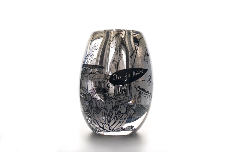 Tales on glass exhibition shows fairytales that are captures between layers of glass. The logic of dreams and surrealism are the main inspirations for the exhibition. The storylines come together from bits and pieces that slowly evolve like songs or poems. The stories are blown between layers of glass by using a century-old Swedish Graal technique that is mixed up with modern 3D-design. The layered images are created layer by layer during a slow process that takes months.