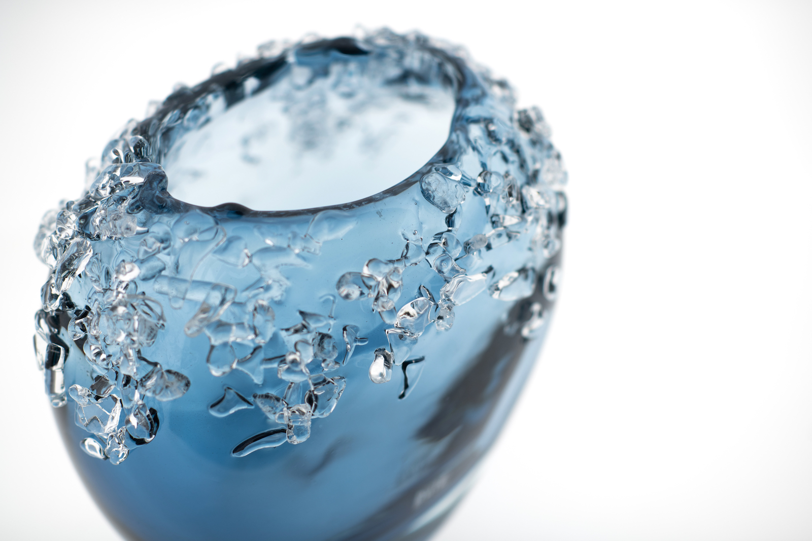 Collection plays with contrasts. High quality meet rough glass shards that look as ornaments when placed on the rim of the vessel. Calm Scandinavian color palette brings harmony to the studio made vases that are inspired by the textures of melting ice. The concept of the design is to flirt with organic shapes and poetic glass medium.